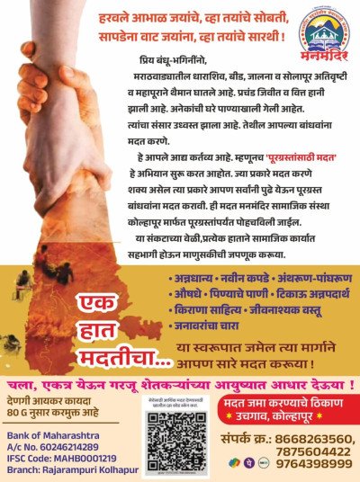 मराठवाड्यातील जिल्हा अतिवृष्टी मदत मोहीम उद्दिष्ट आणि दृष्टीकोन धाराशिव, बीड ,लातूर व सोलापूर जिल्ह्यात झालेल्या अतिवृष्टीमुळे अनेक कुटुंबांचे मोठे नुकसान झाले आहे. पूरग्रस्तांना तातडीने मदत पोहोचवणे हे या मोहिमेचे मुख्य उद्दिष्ट आहे. या मोहिमेद्वारे आपण निवारा, अन्न, पाणी आणि वैद्यकीय मदत पुरवून त्यांना या संकटातून बाहेर पडण्यासाठी हातभार लावणार आहोत. आपला सामूहिक प्रयत्न या कुटुंबांना पुन्हा उभे राहण्याचे बळ देईल, असा आम्हाला विश्वास आहे. सामाजिक परिणाम ही मोहीम केवळ तात्पुरती मदत नसून, समाजातील प्रत्येक घटकाला एकमेकांशी जोडून सामाजिक एकतेचे महत्त्व अधोरेखित करते. आपल्या लहानशा मदतीने अनेक जीव वाचू शकतात आणि भविष्यात अशा संकटांना तोंड देण्यासाठी एक मजबूत सामाजिक जाळे तयार होऊ शकते. चला, एकत्र येऊन माणुसकीचा हा संदेश जगभर पोहोचवूया. धन्यवाद तुम्ही मदत ऑनलाईन पद्धतीने पैसे देऊन करू शकता. या मोहिमेत सहभागी झाल्याबद्दल आणि आपले सहकार्य दिल्याबद्दल मनःपूर्वक आभार. चला,पूरग्रस्त शेतकरी गरजूंच्या आयुष्याला आधार देऊया! मनमंदिर बहुउद्देशीय सेवाभावी संस्था कोल्हापूर, गरजूंना आधार देण्यासाठी सातत्याने कार्यरत आहे. आपला छोटासा हातभार गरजूवंत पूरग्रस्ताची स्वप्नांची पूर्तता करू शकतो. . संपर्क: +?? ???? ?? ???? . QR कोड स्कॅन करून, गरजूंसाठी आशेचा किरण उजळूया!